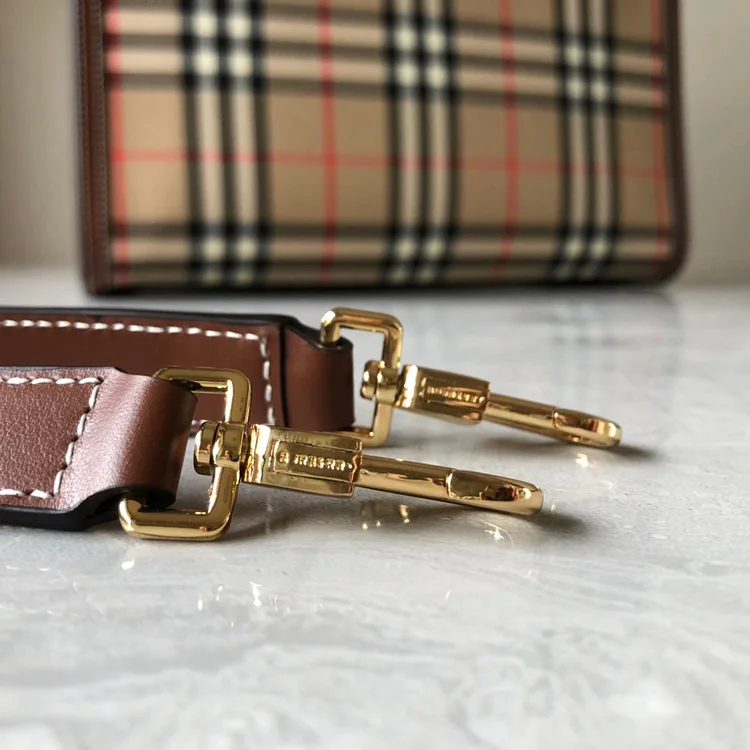 • A refined silhouette in our archival Vintage check. accented with smooth leather trims and polished triple-stud detailing. Carry it by the top handles or on the shoulder using the detachable strap.