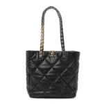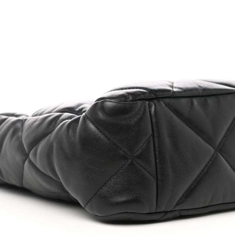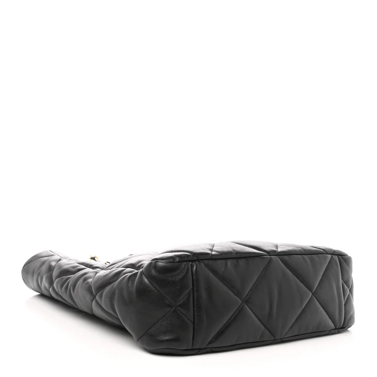 This is an authentic CC Lambskin Quilted CC 19 Shopping Bag in Black. This stylish handbag is crafted of diamond-quilted calfskin leather in black. The bag features leather threaded chain shoulder straps and a matching CC logo on the front. The open top with magnetic closure leads to a red fabric interior with a pocket.