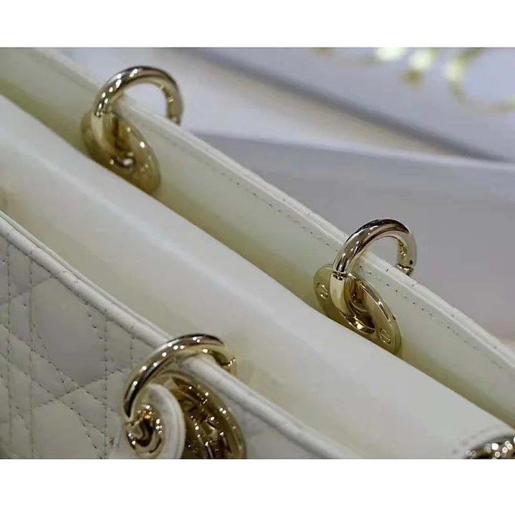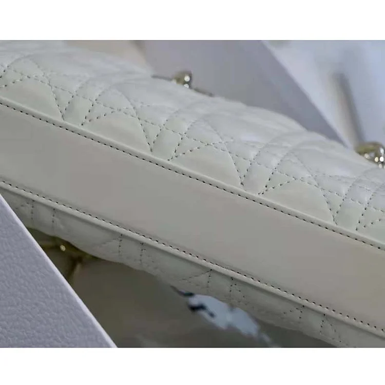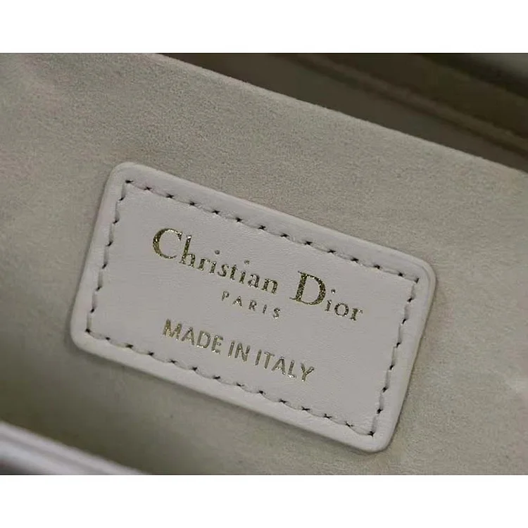 Crafted in latte lambskin with Cannage stitching. the refined and timeless style is enhanced by pale gold-finish metal ‘D.I.O.R.’ charms elegantly embellishing its silhouette.