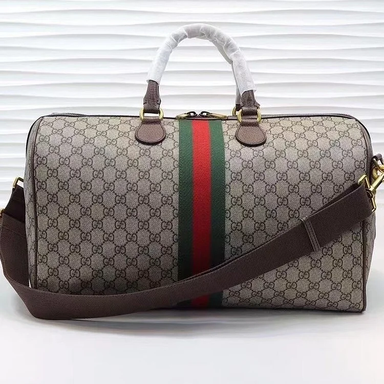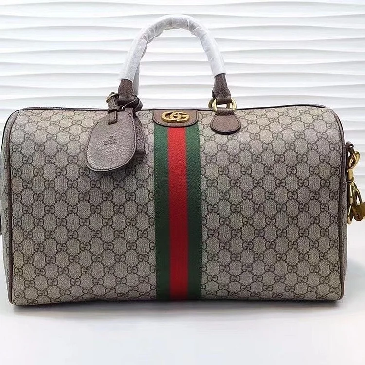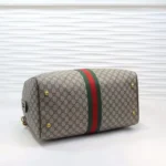 The world of Gc Savoy evolves with the introduction of a duffle shape crafted in soft GG Supreme canvas with inlaid green and red Web stripe. A contemporary take on a Gc archival belt buckle from the ’70s. the Double G is repurposed and appears atop a textured leather tab detail. The carry-on is completed with a detachable and adjustable strap. lock with key holder and luggage tag.