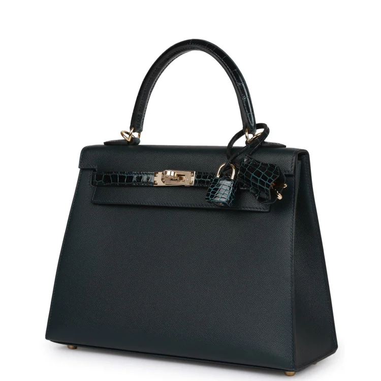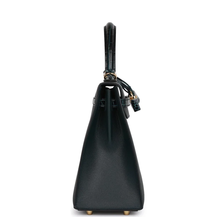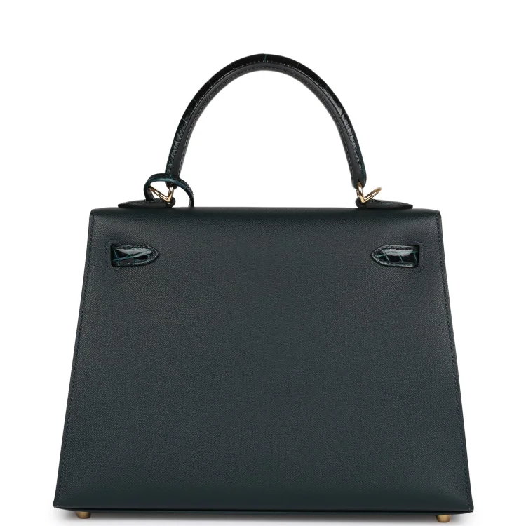 This Kelly. in theSellierstyle. is inVert Rousseau madameleather andshiny niloticus crocodilewithgold hardware and has tonalstitching.front flap. two straps with center toggle closure. clochette with lock and two keys. single rolled top handle and removable shoulder strap.