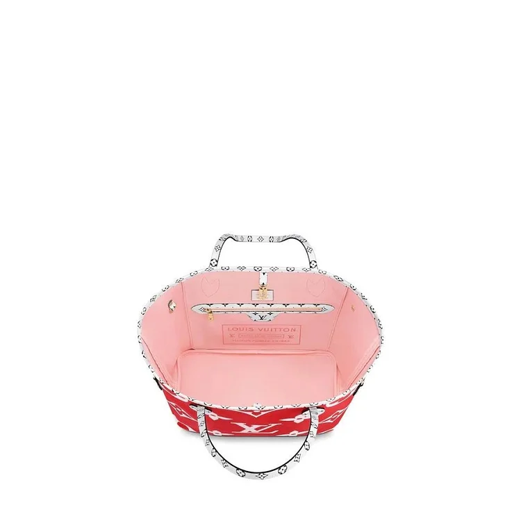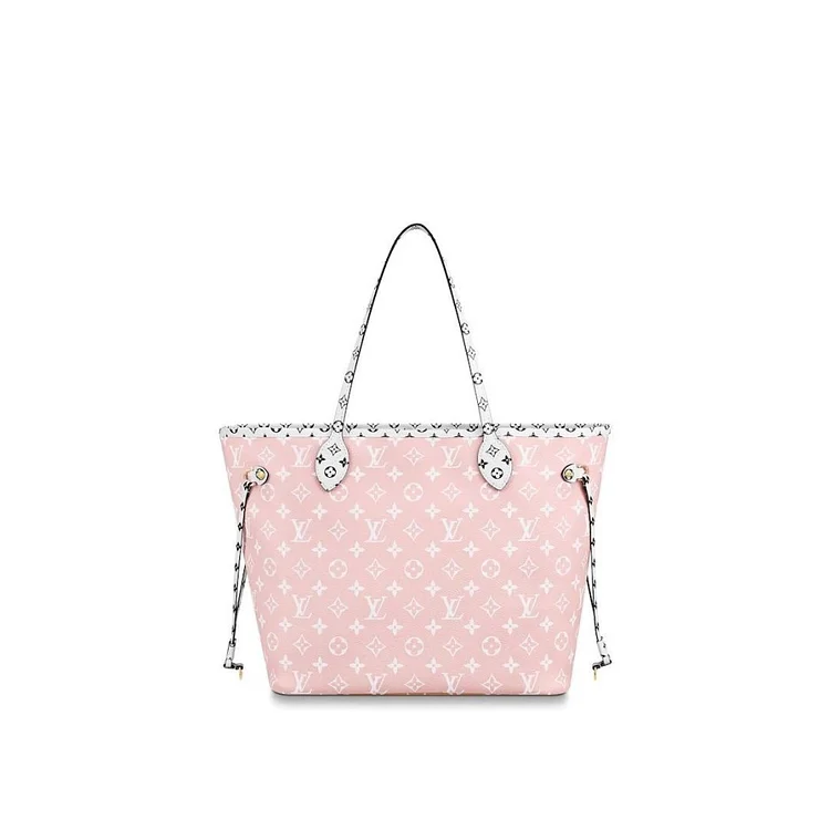 Playful. colorful. Neverfull: this season the iconic carryall wears a bold new spin on Monogram canvas. XL and Mini versions of the signature motif combine in sunny color palettes for a fun. summery look. Worn over the shoulder or carried on the arm. this MM model pairs perfectly with both beach and city looks.