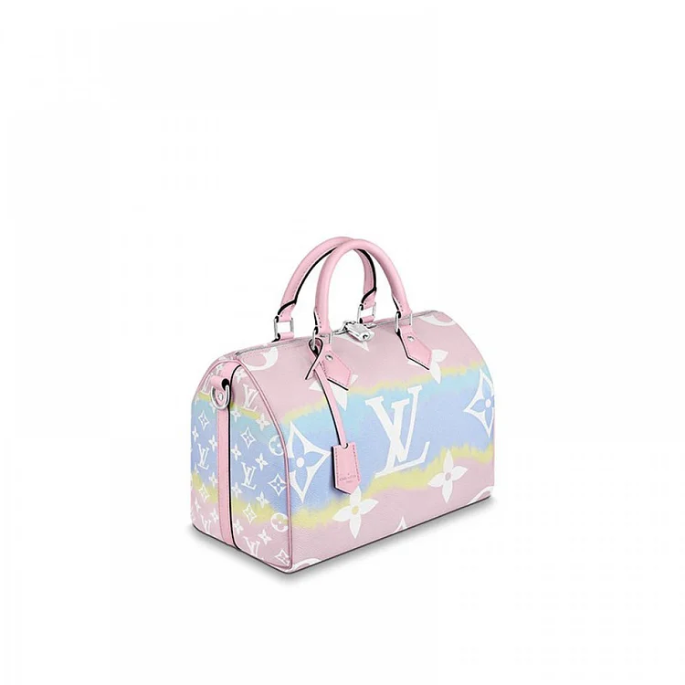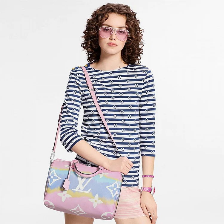 Tie-Dye Monogram canvas brings a beachy feel to the Speedy Bandoulière 30. a classic L city bag relooked for the Escale Collection. The rolled-leather handles and distinctive shape make this bag immediately recognizable while the removable strap offers the option of comfortable shoulder carry. It’s signed with the iconic engraved padlock.