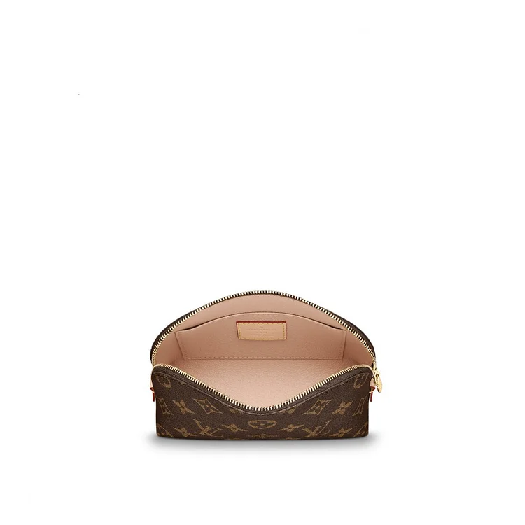 This compact cosmetic pouch in Monogram canvas slips easily into a handbag or suitcase. Its round shape and flat base facilitates access to small products.
