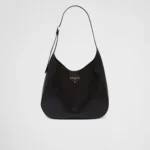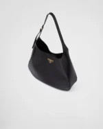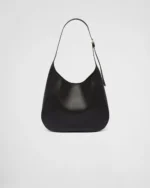 A bold and refined silhouette characterizes this leather shoulder bag with fine details. The geometric construction contrasts with soft lines to create a modern and elegant yet sporty bag. an expression of the hybrid concept and part of the Prada’s aesthetic code.