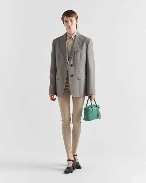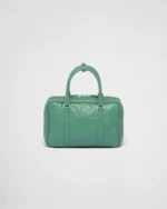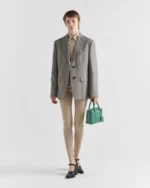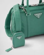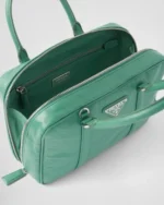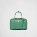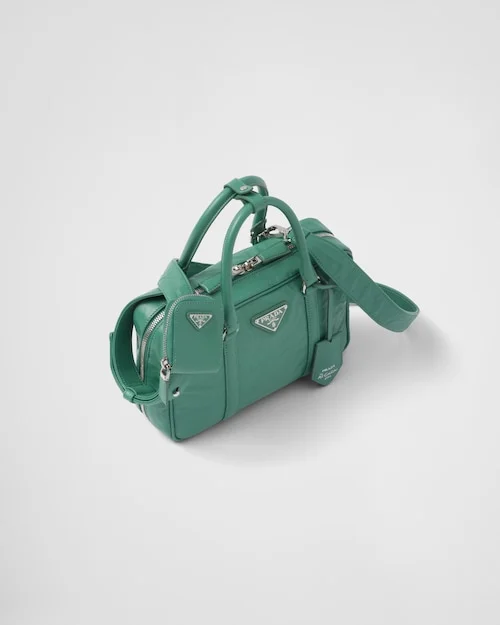 This bag with casual. classic allure is made of glossy nappa leather with a natural finish. The handmade wrinkled effect contrasts with the concept of a rigid construction. reinterpreting an everyday object that can be worn without constraints. Presented for the Spring Summer 2023 collection. the accessory that is a re-edition of a bag presented in 2001 is decorated with the enameled metal triangle logo.